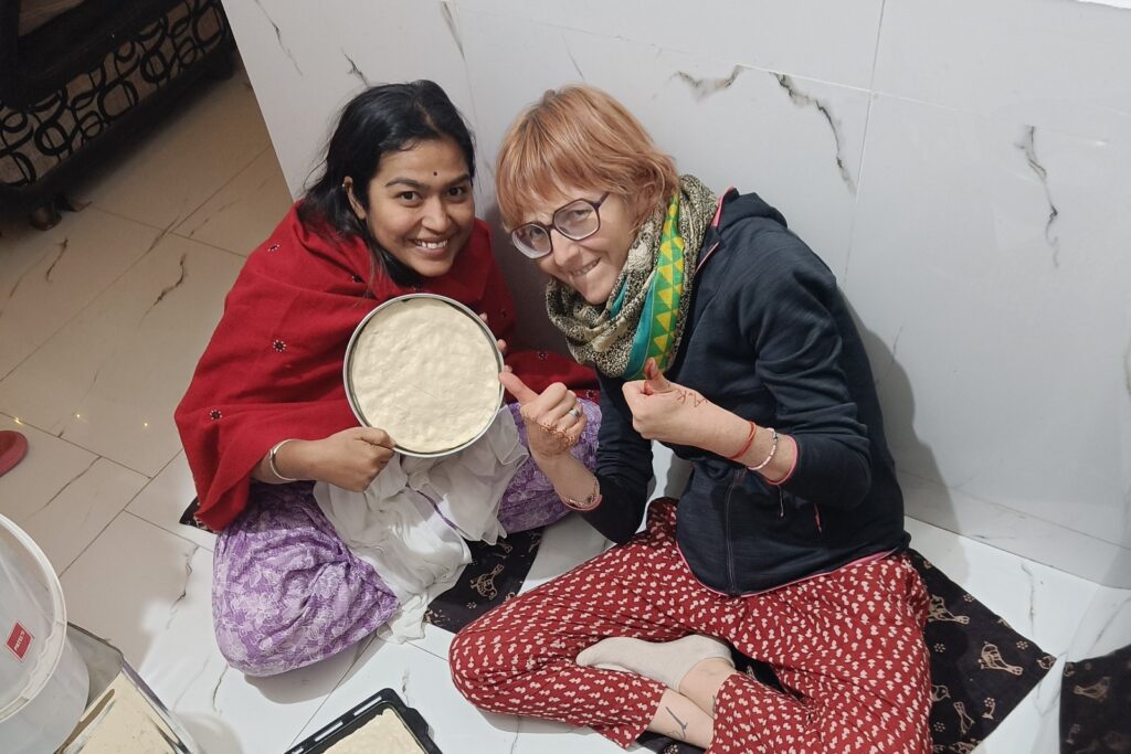 Una sera in particolare siamo tornati e abbiamo visto la nonna in cortile, davanti a un forno di terracotta con un fuoco di legna. Impastava e cucinava millet bread, un tipo di pane indiano particolare tipico del Rajasthan, che ci piace tantissimo.